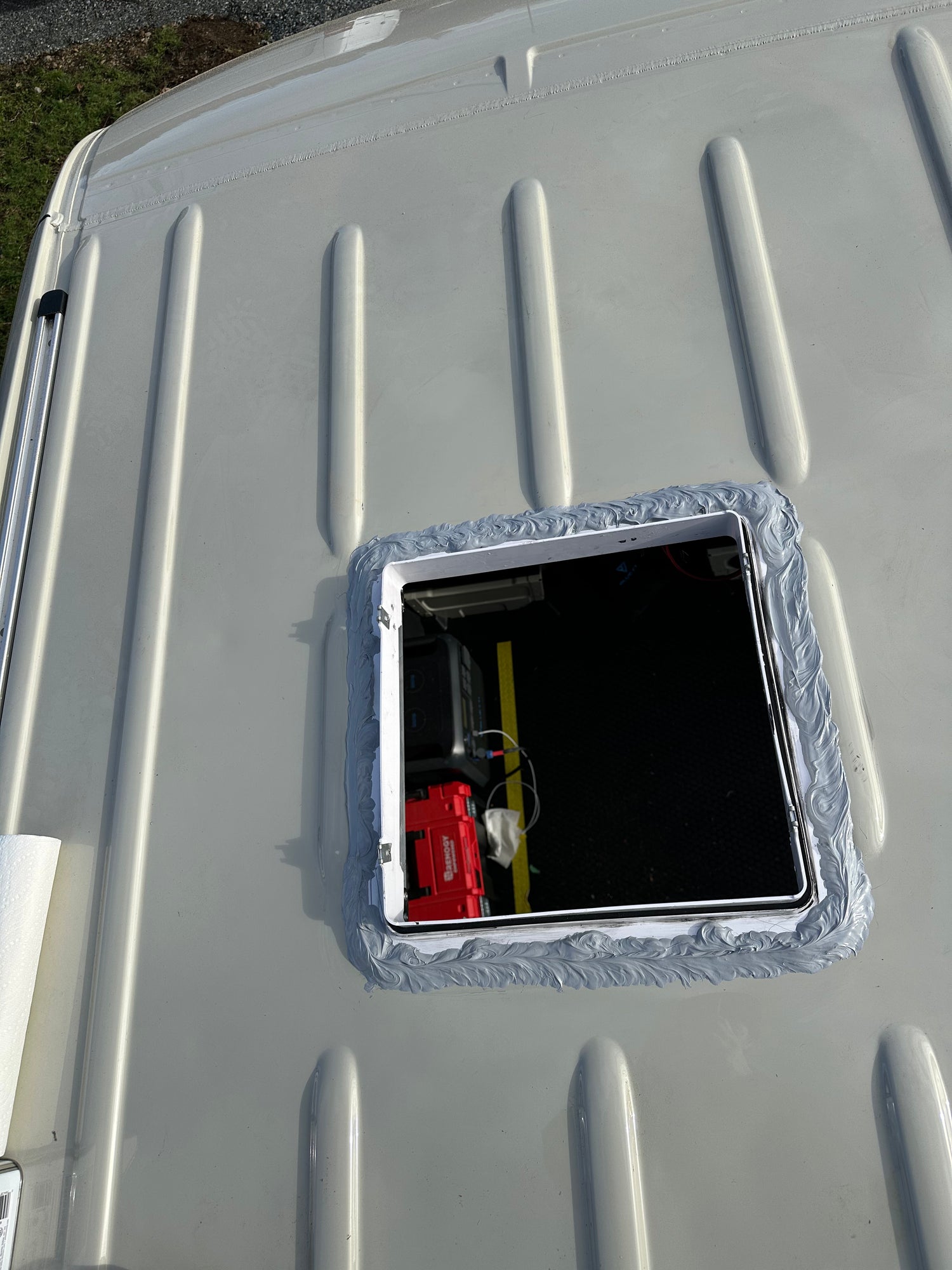 Install of Maxxair fan or similar. Install on rear of van may require additional trim ring.