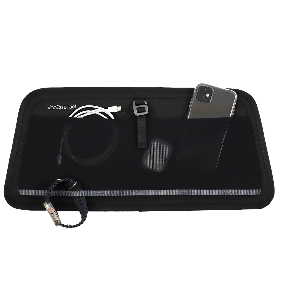 Maximize storage space in your van by installing our Upper Rear Door Storage Panels. These sleek, sturdy panels feature a large mesh pocket with a metal hook closure to keep your phone, glasses, or other small gear items secure. The bottom of the panel has an integrated daisy chain so you can easily snag high use items.