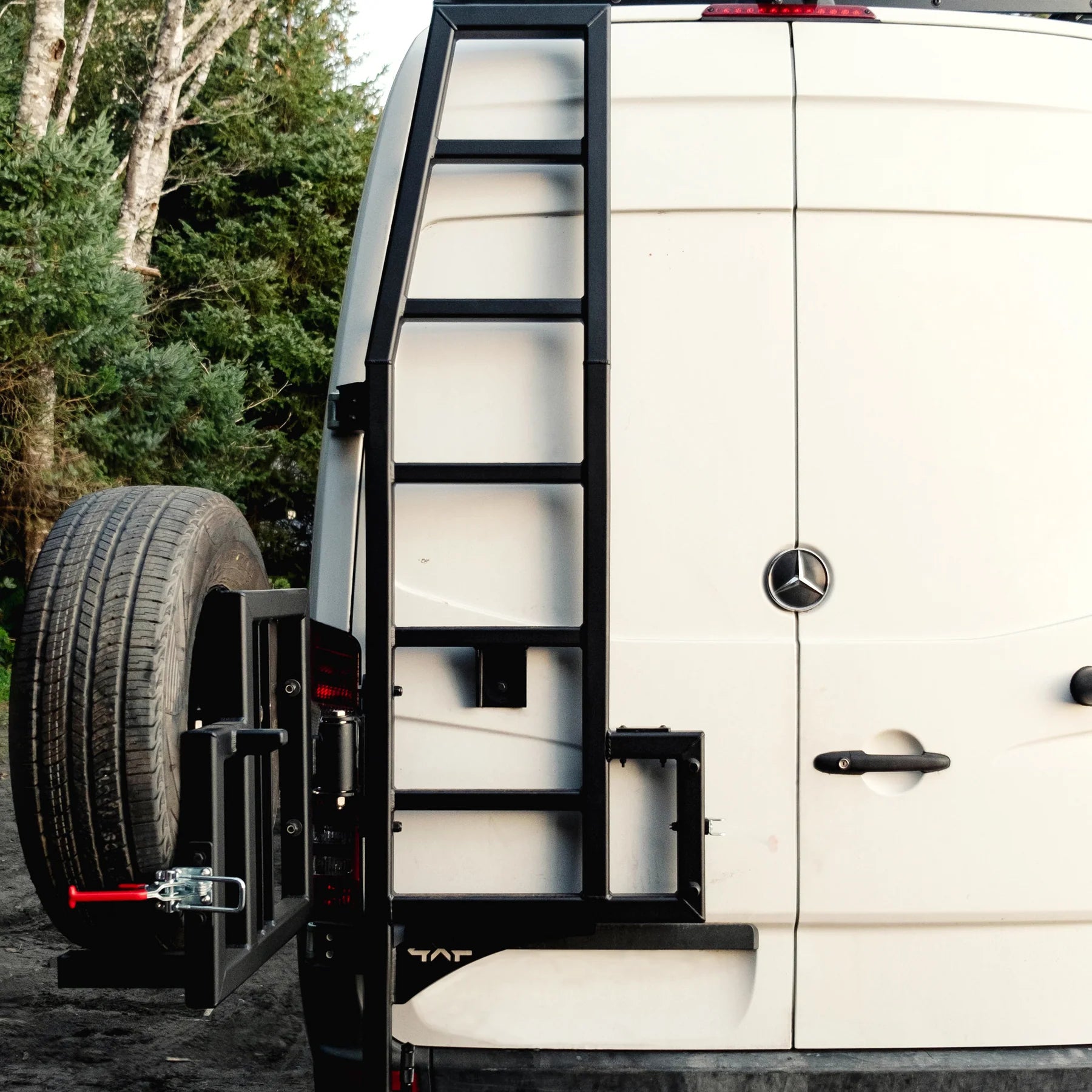 The door-mounted ladder tire carrier for Mercedes Sprinter vans is a lightweight, durable solution for adventurers. Made from high-grade aluminum with a sleek black powder-coated finish, it resists corrosion and minimizes added weight.
