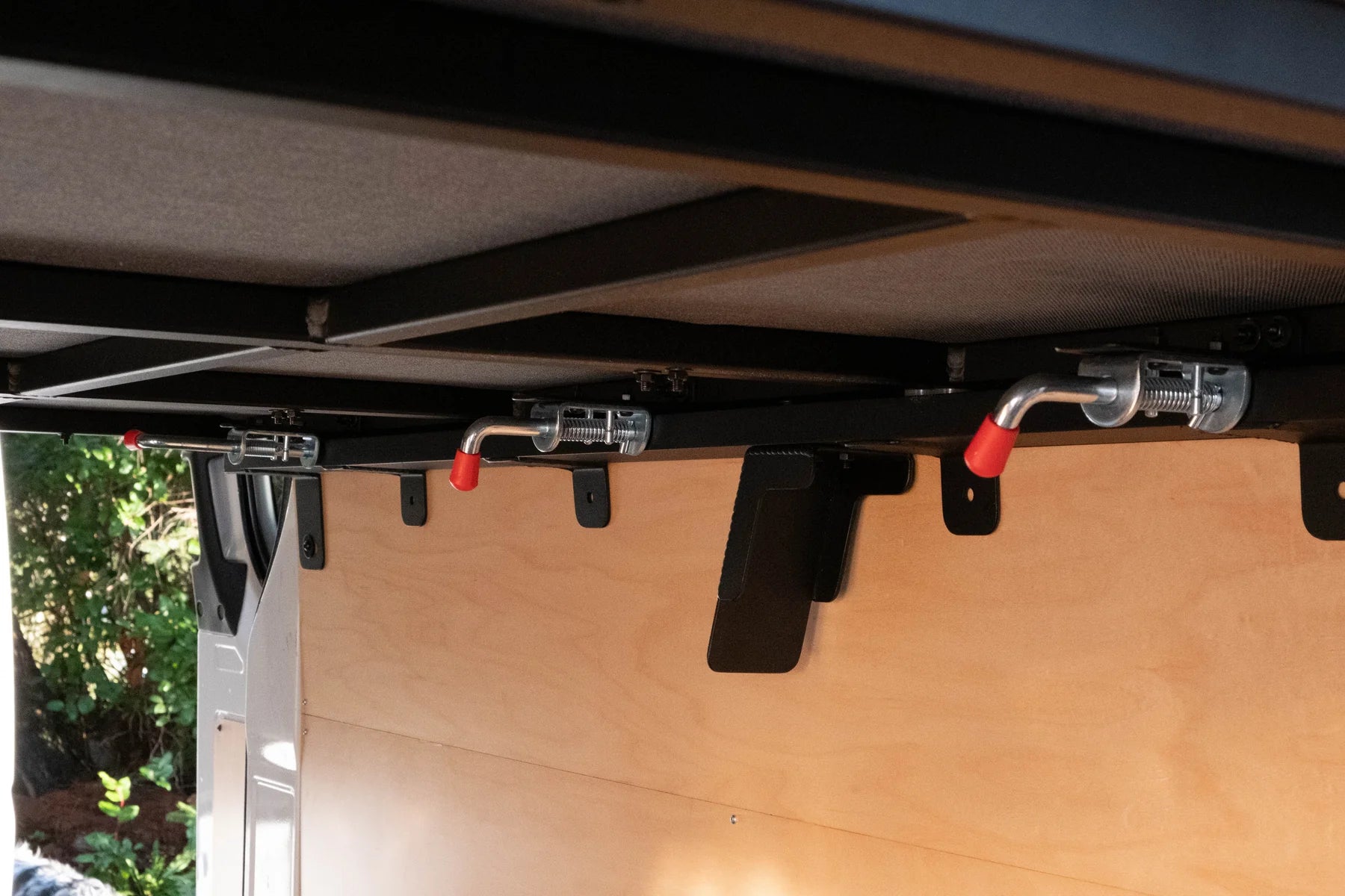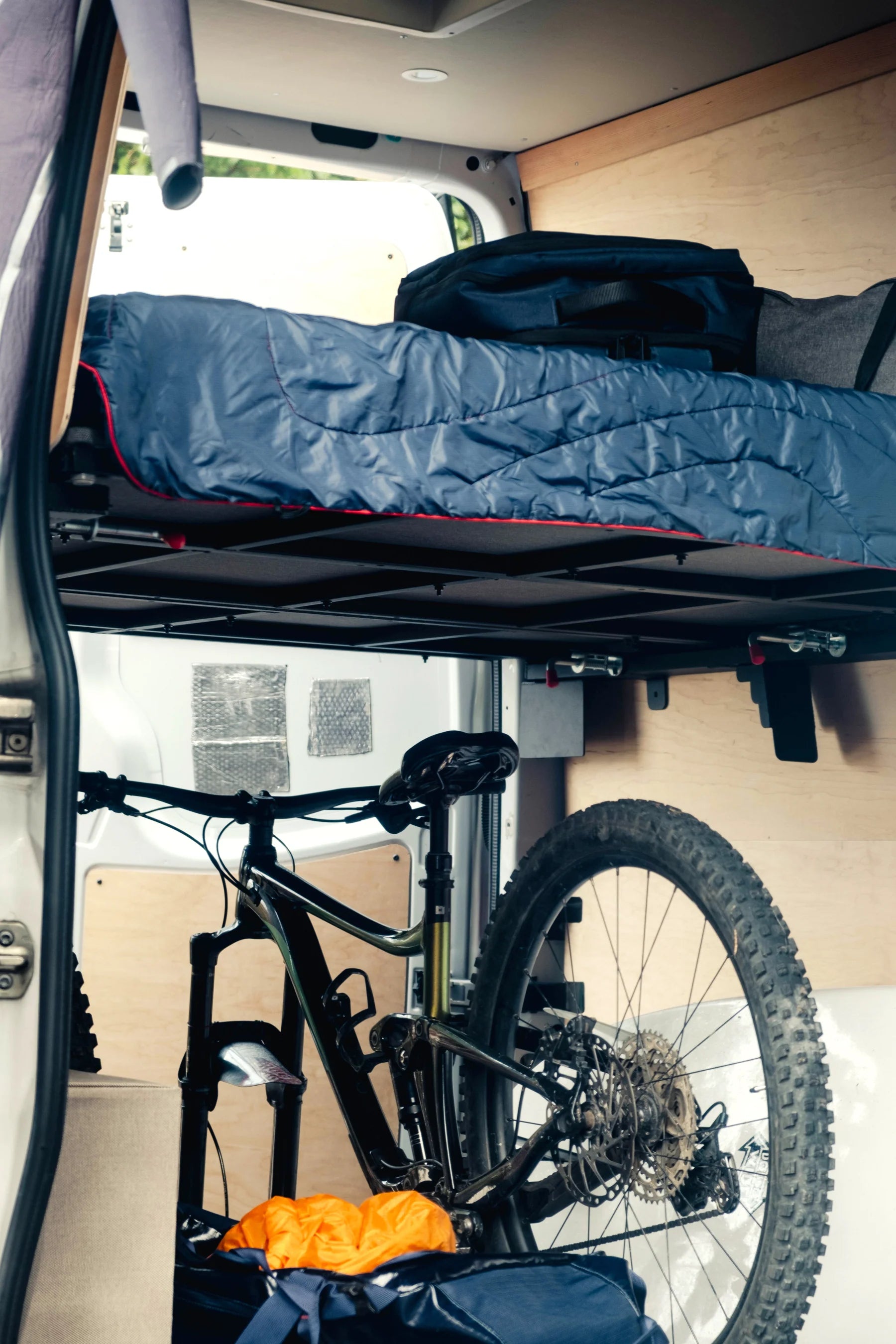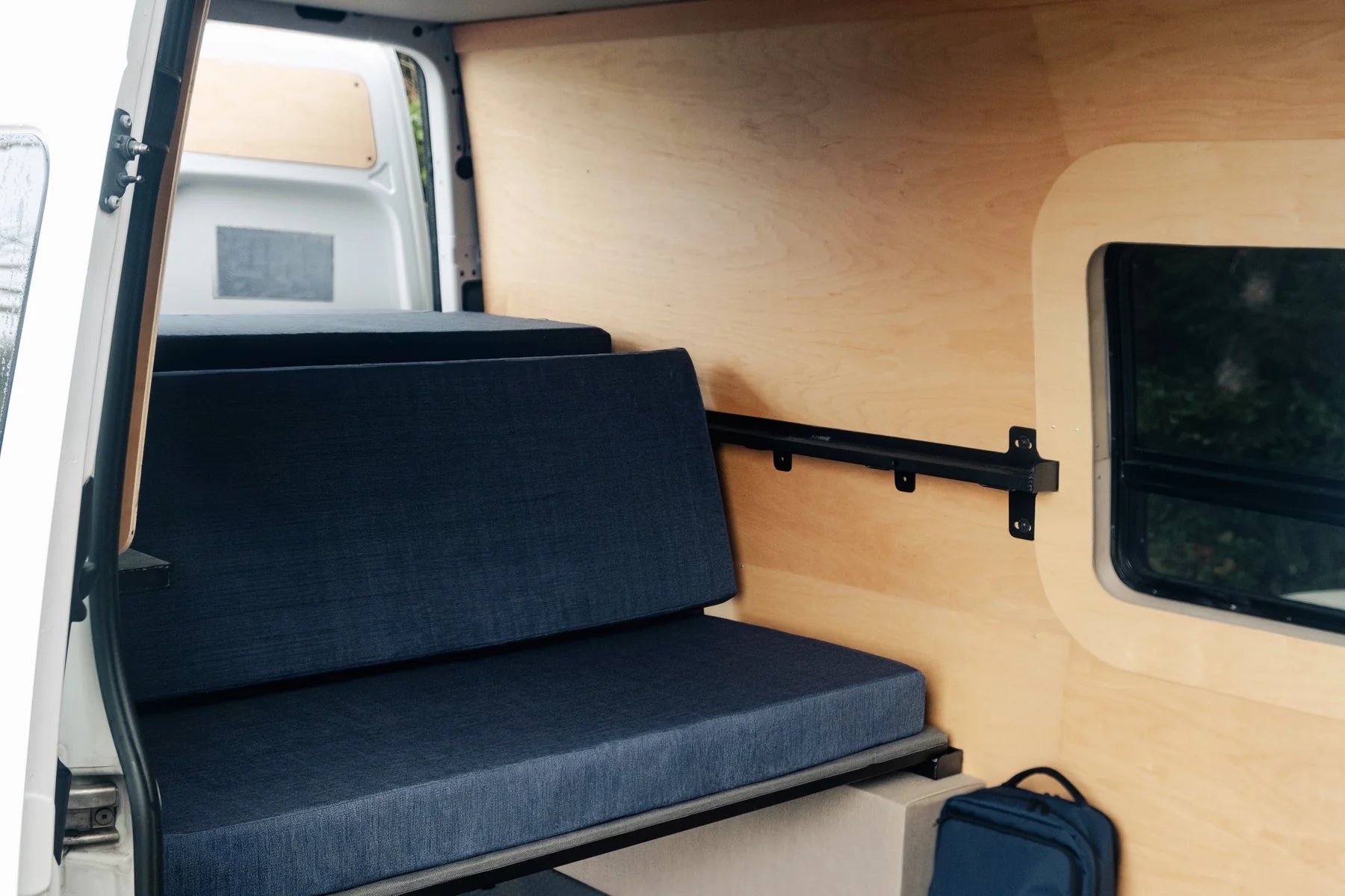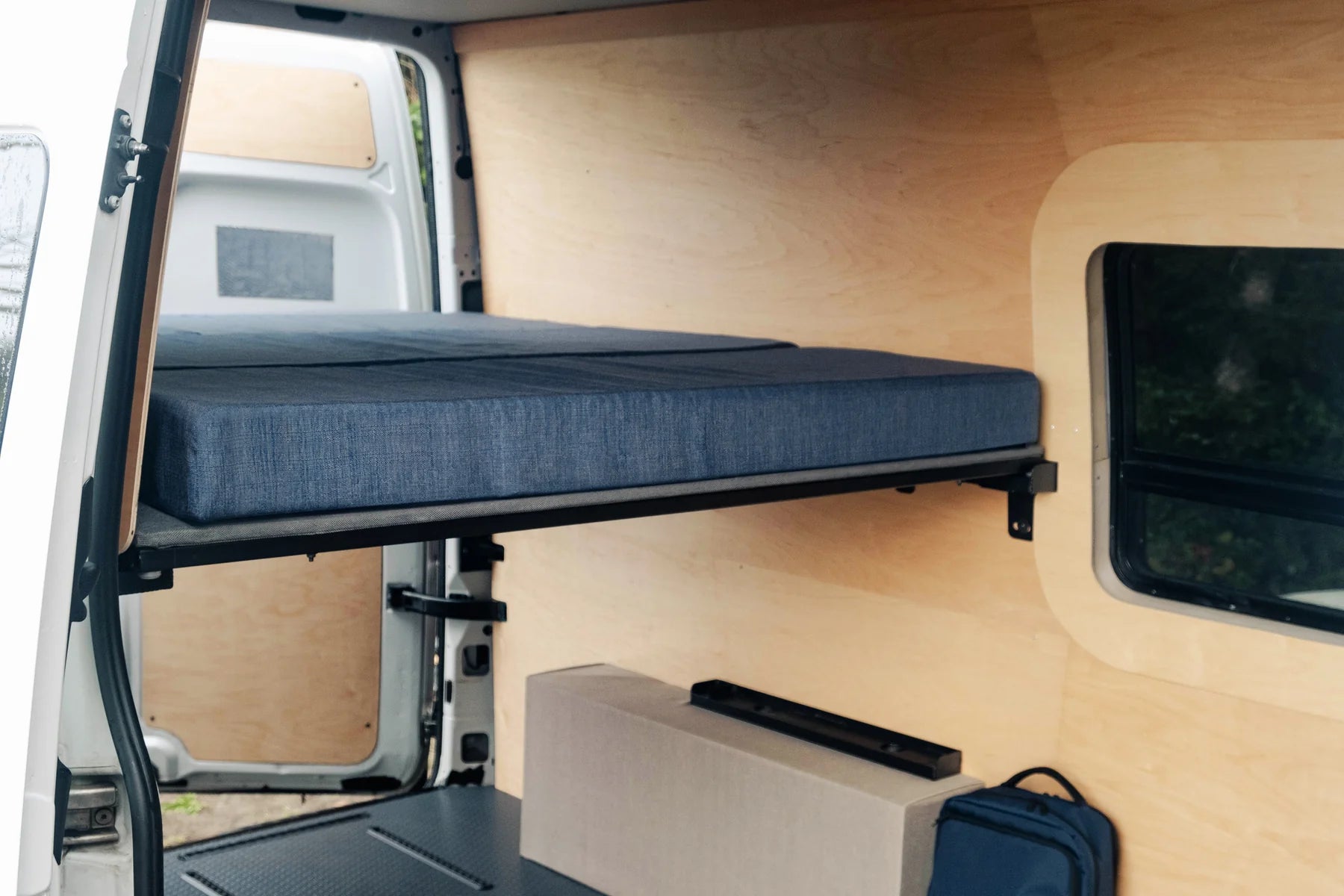 Maximize space and versatility in your Mercedes Sprinter 144 with our 3-Panel Convertible Bed System. Designed for adventurers, this lightweight aluminum bed mounts securely to the van's walls while providing ample storage below for mountain bikes, surfboards, and all your essential gear.