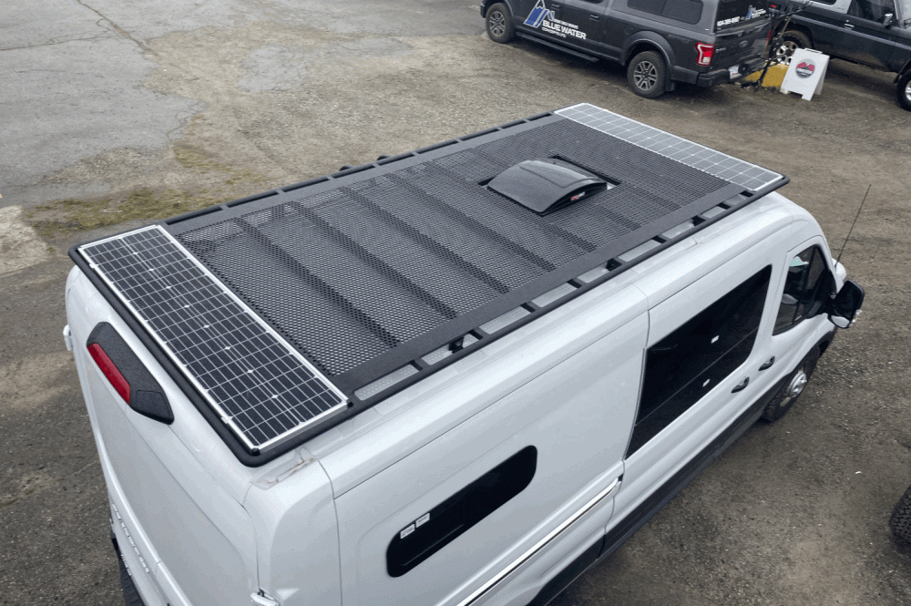 The Kona racks includes: powder coating (black), punch plate decking, openings for MaxAir vents (front & rear), up to 2 solar panels brackets (flush with decking), light tabs and mounting plates.