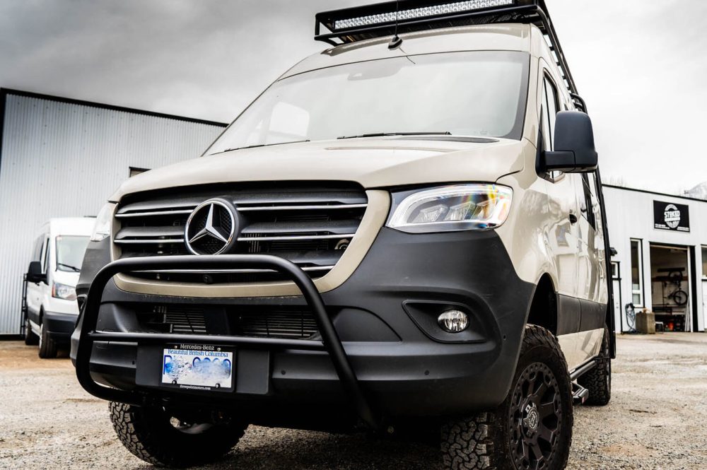 Our MOAB brush guard was designed to protect your front end, but also create a sleek minimalist look by following the lines of the Sprinter with a reverse mirror effect of the front grille for the best aesthetic balance. The MOAB brush guard is compatible with all sensors and front camera .
